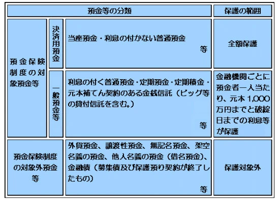 預金保護制度の分類と保護の範囲をまとめると、下記の表のようになります。