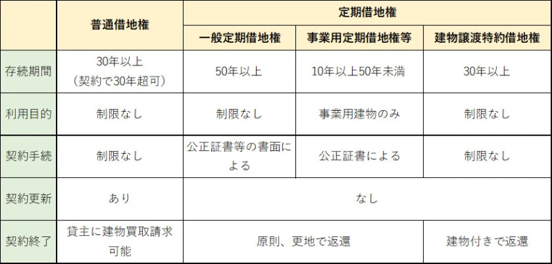 また、借地権は、建物所有を目的として土地を借りる権利をいいます。定期借地権とは契約更新がない借地権をいい、普通借地権は契約更新がある借地権となります。